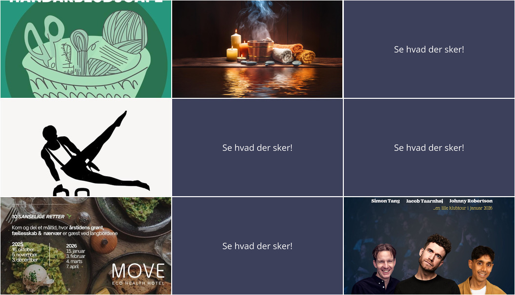 Torsdag aften inviterer MOVE Eco Health Hotel til en kulinarisk oplevelse med fokus på årstidens grønt. Nyd 10 sanselige retter ved langbordene med bæredygtighed, fællesskab og nærvær i centrum.